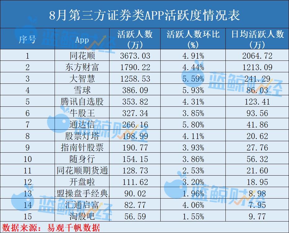 (记者 陈晓娟)8月以来,A股市场热度持续升温,交投空气活跃。两融余额持续上扬,据Wind数据,截至8月29日,两融余额合计达22613。10亿元。当月所A股新开户数达265。03万户,同比激增165%。新开户数的翻倍增加无效带动证券App活跃度提拔,易不雅千帆数据显示,8月证券办事使用月活跃用户数达1。73亿,同比增加27。26%,创年内新高。