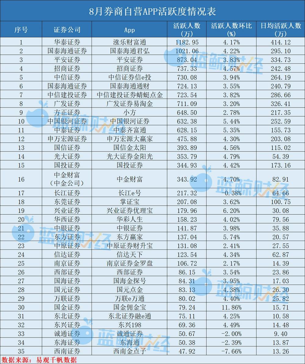 券商阵营中,11家券商App的月活人数冲破500万。2家券商App迈入万万量级,华泰证券涨乐财富通以1182。95万月活居首。