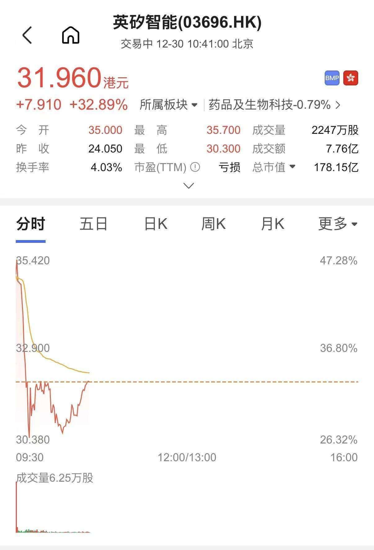 英矽智能发售价为24。05港元(约合人平易近币21。68元)/股,开盘上涨45。5%,为35。00港元(约合人平易近币31。55元)/股。截至10点40分,英矽智能股价上涨32。89%,为。