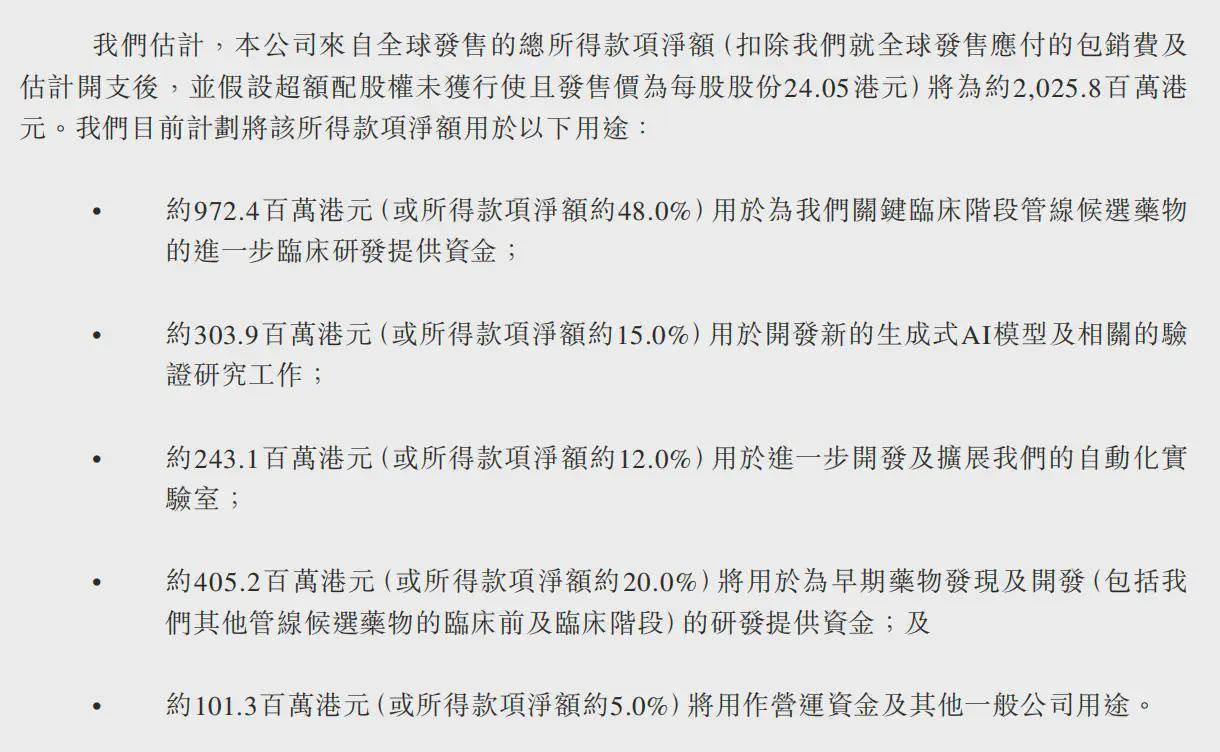 此中,48%的资金将用于环节临床阶段管线候选药物的进一步临床研发,其他资金还将用于留住或招募25-30名AI人才,正在阿联酋采办35-45台办事器以及采购300-350颗芯片等。