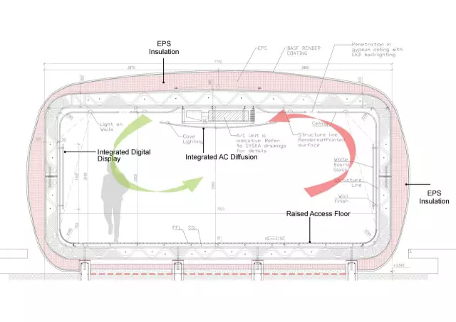 建建的全数布局利用一个高20英尺,长120英尺,宽40英尺(约6米*36米*12米)的3D打印机和添加混凝土打印手艺。打印机操纵全从动机械臂实现打印过程,用时17天,现场安拆2天。后续的办事、室内和景不雅破费了大约3个月。比拟保守的小标准建建,立异施工手艺削减了一半的劳动成本,有帮于削减整个项目标正在中留下的踪迹。